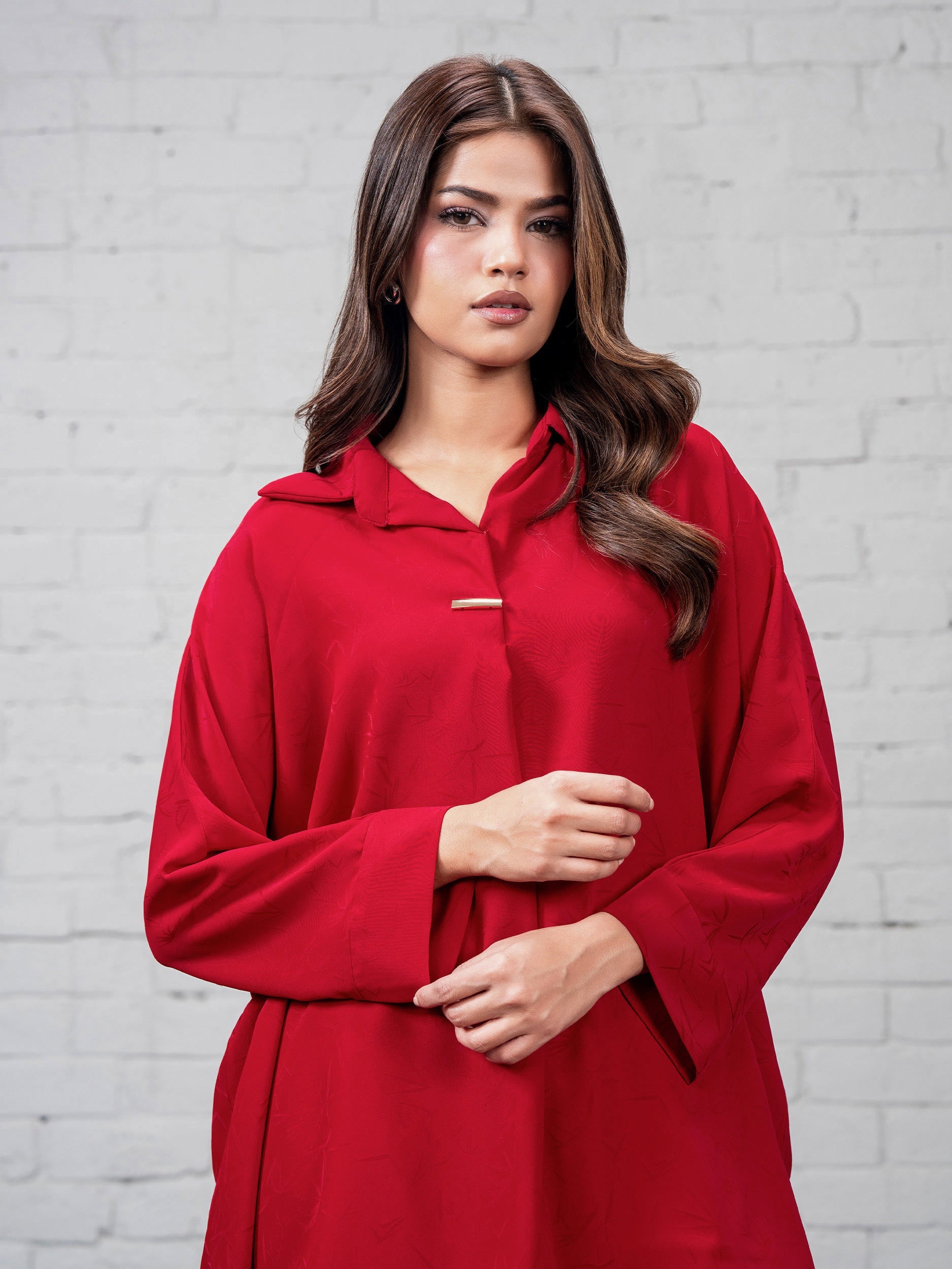 • Flowy top with a collared neckline, mock placket detailing, and wide cuffed sleeves