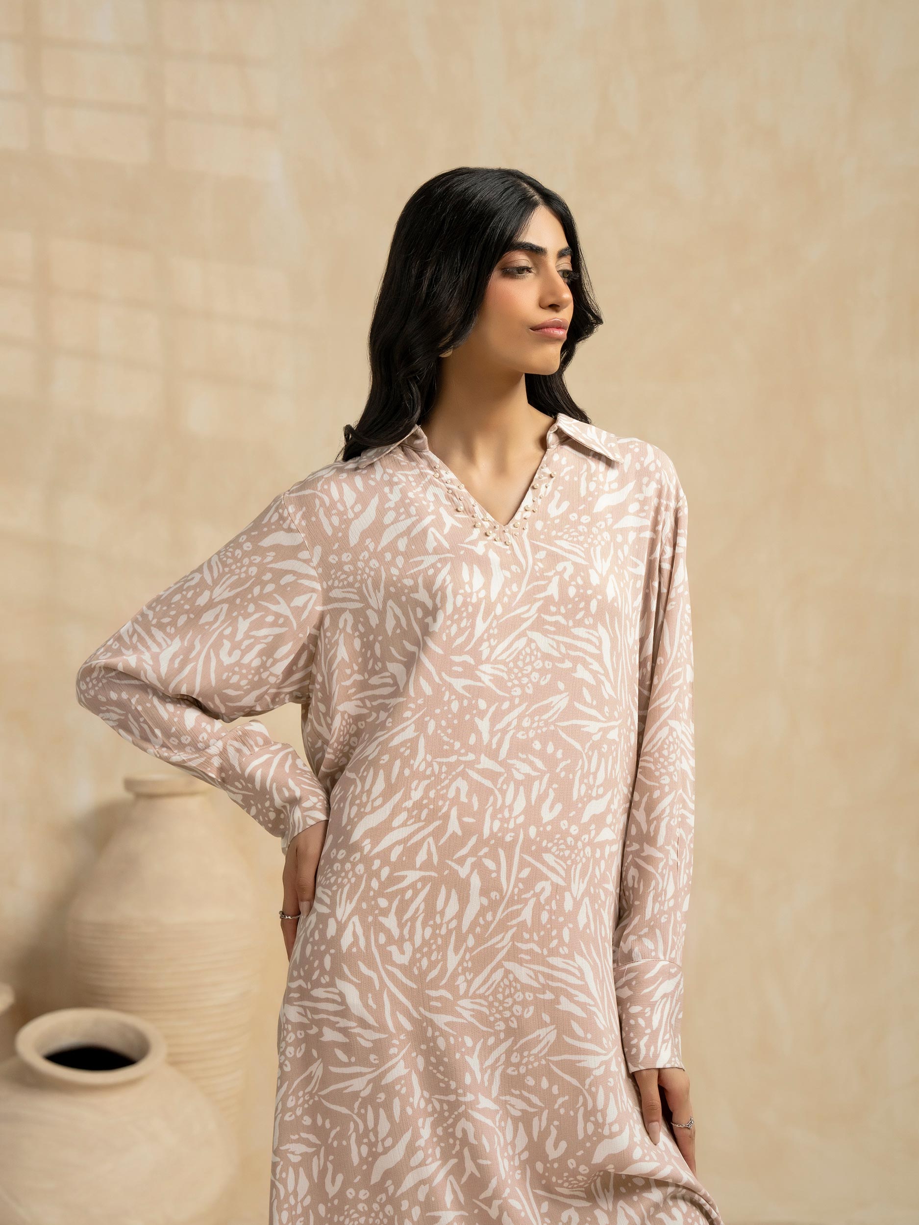 - Printed dress with pearls detailing on neckline