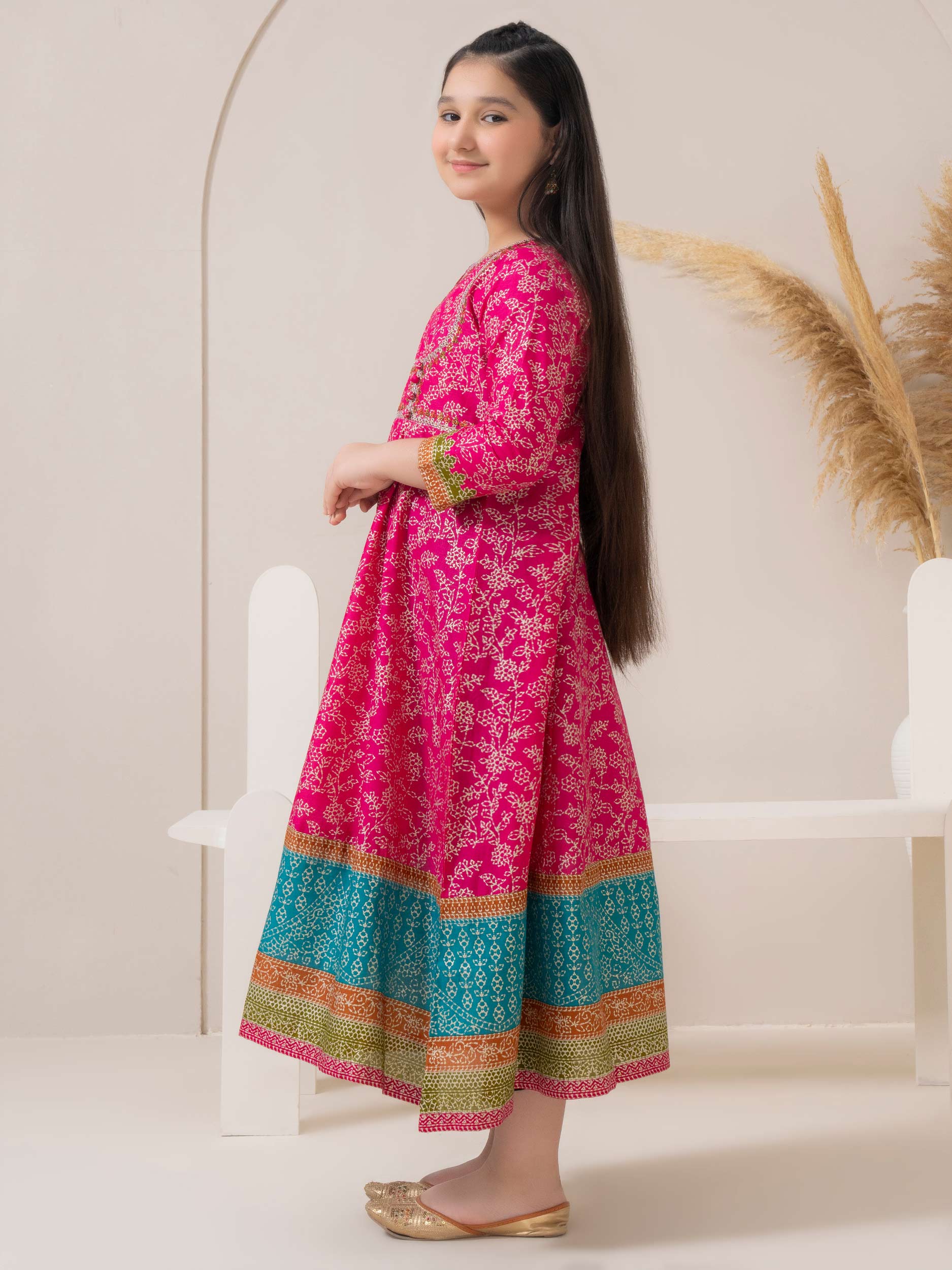 - Paste print embroidered angrakha style frock with button detailing on