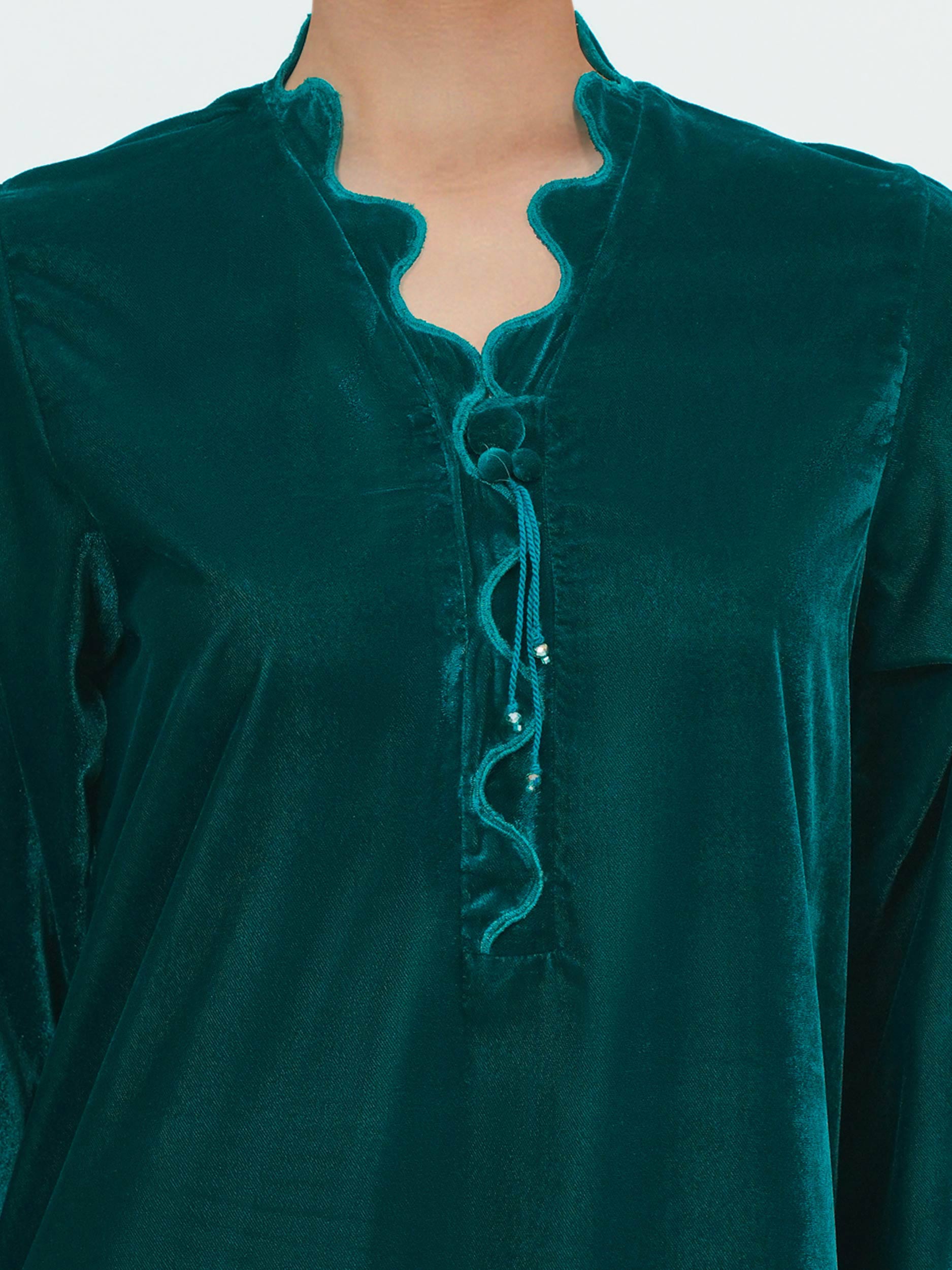 - Knot-detail scalloped neckline and scalloped sleeves