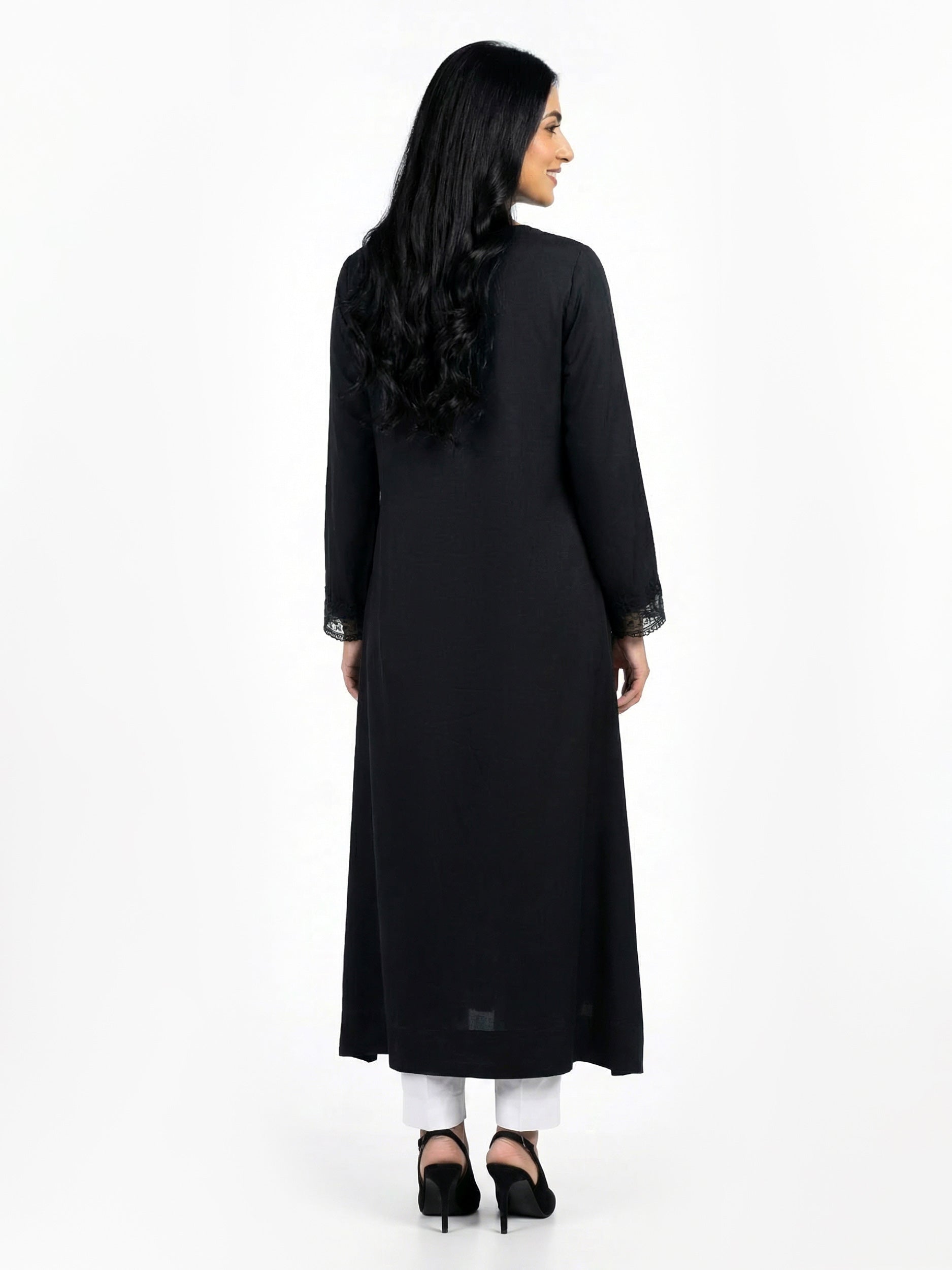 - Flowy long shirt with an embroidered, cutwork-detailed