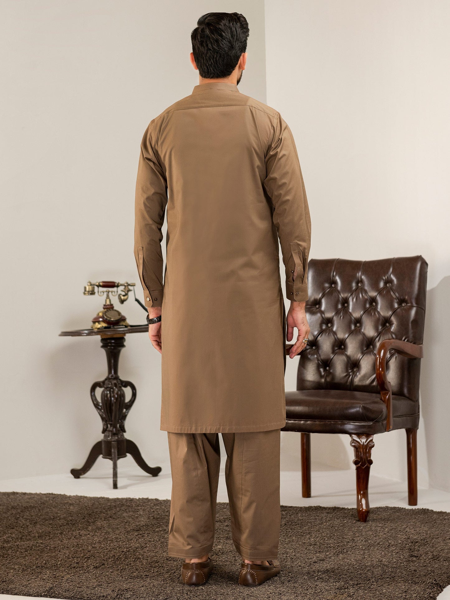 • Antique button closure on the placket and cuffs