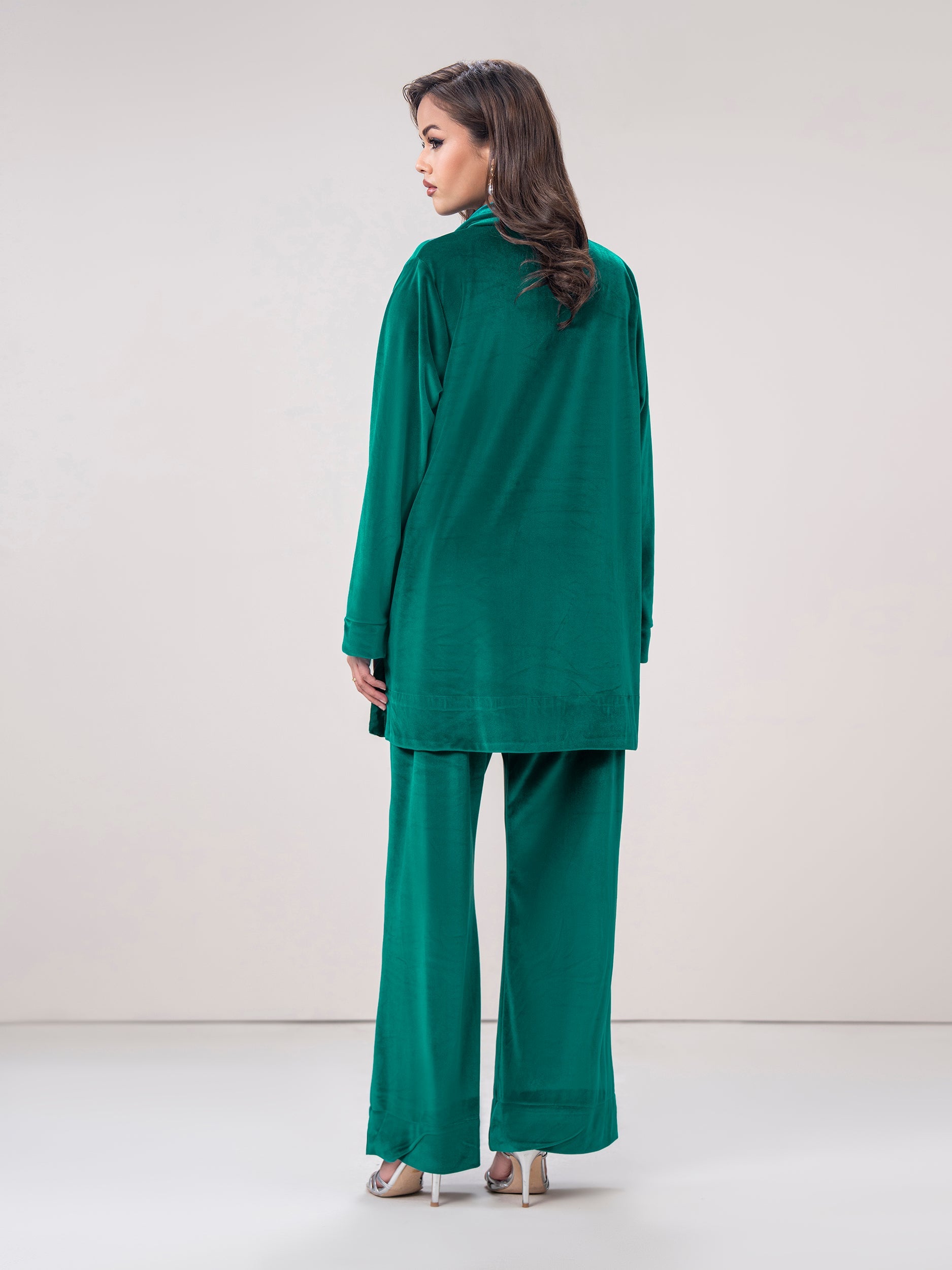 - Stone embellished solid top with collar neckline and cuff sleeves